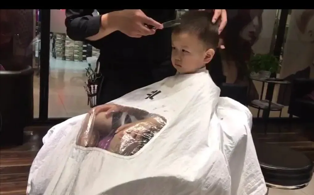 20170708,团团剪头,围个剪头的围布也帅。将来得有多少迷妹,哈哈。团团特乖,从小剪头就乖乖的,很配合。