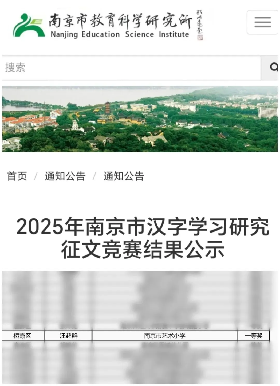 冬日暖阳传佳讯,杏坛耕耘结硕果。近日,南京市教育科学研究所开展的2025年南京市汉字学习研究征文竞赛结果正式揭晓,我校汪超群老师的论文《字解边塞:基于汉字源流与地理关联的“汉字+”项目化学习实践》,荣获市一等奖!