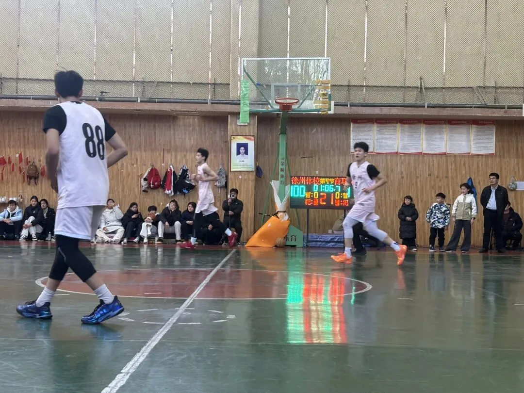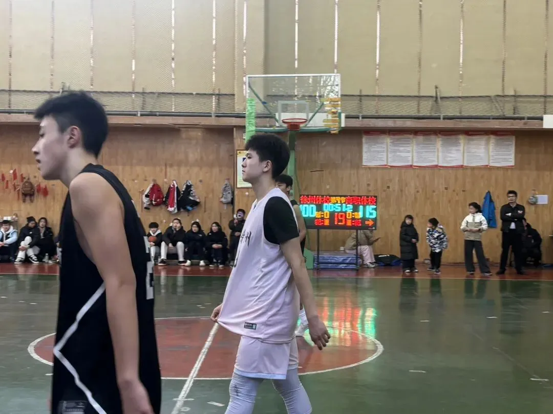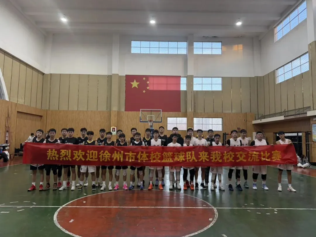 比赛现场气氛热烈,看台上“热烈欢迎徐州市体校篮球队来我校交流比赛”的横幅格外醒目,彰显着东道主的热情好客。随着裁判一声哨响,比赛正式拉开战幕。