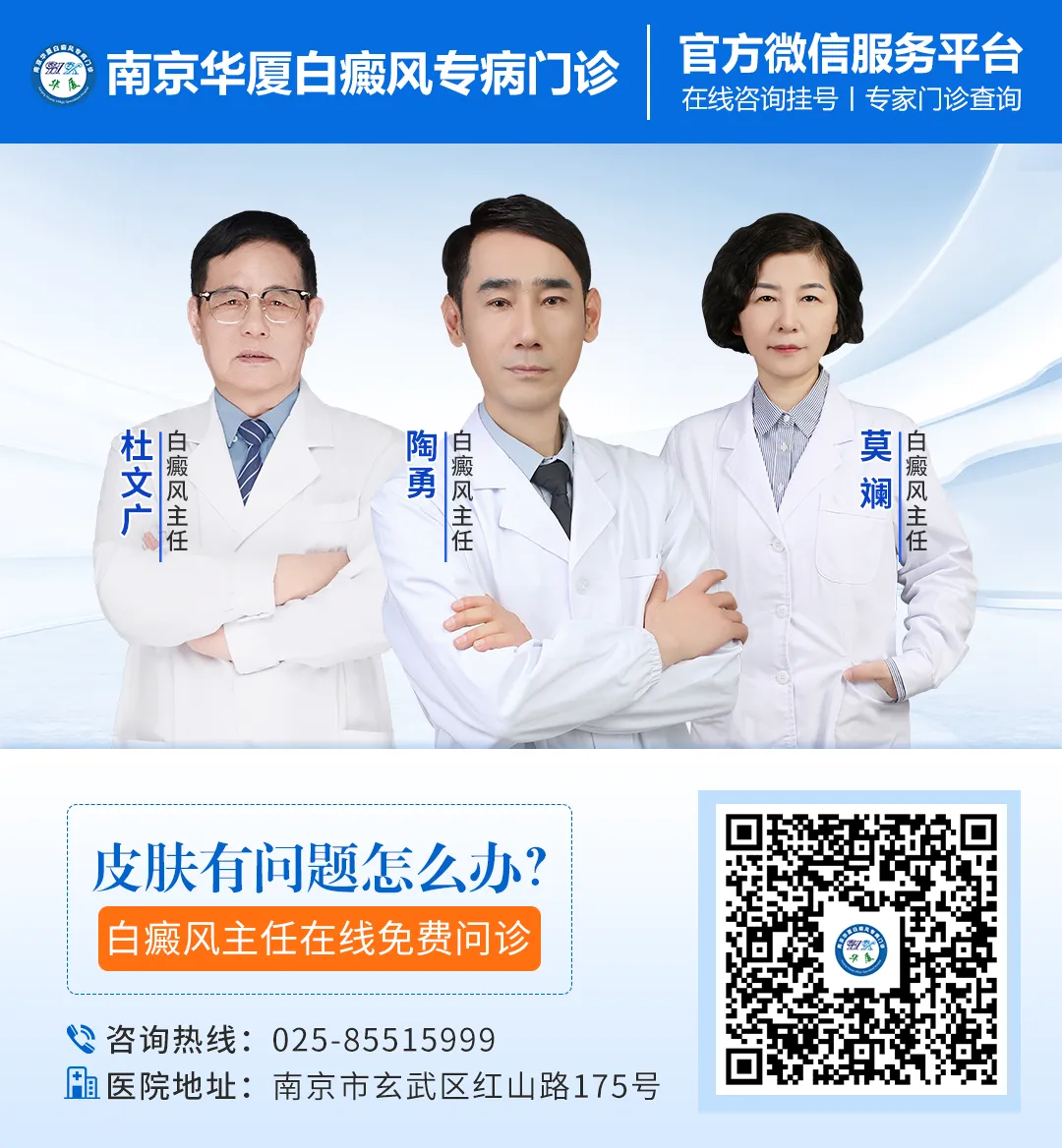 官方微信公众号:关注“南京华厦白癜风门诊挂号”官方微信公众号,点击底部菜单栏“预约挂号”,按提示填写个人信息及就诊需求,即可完成预约,操作简单便捷。