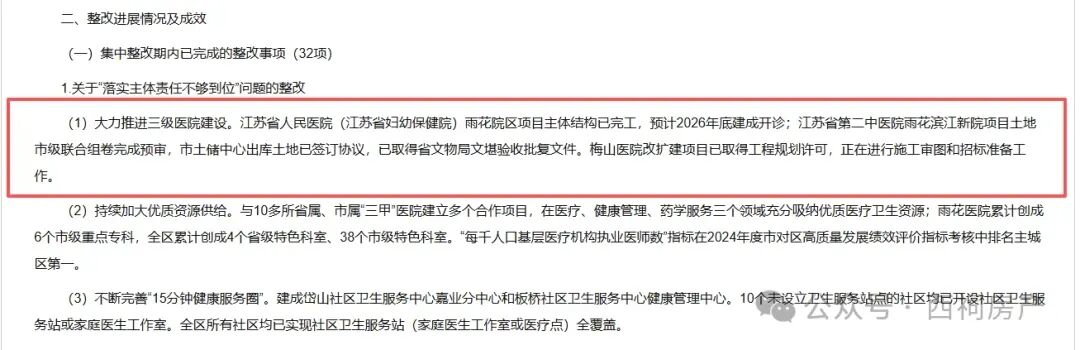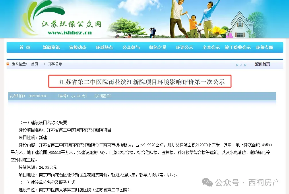 2025年4月8日,该医院项目环境影响评价第一次公示”发布。据显示,江苏省第二中医院雨花滨江新院项目总投资24.06亿元,占地9.9920公顷,规划总建筑面积212070平方米,其中:地上建筑面积146560平方米,地下建筑面积65510平方米,拟建设康复中心、门急诊综合楼、综合住院楼、医技楼、科研教学综合楼等建筑,以及水电消防、道路绿化等室外附属工程。