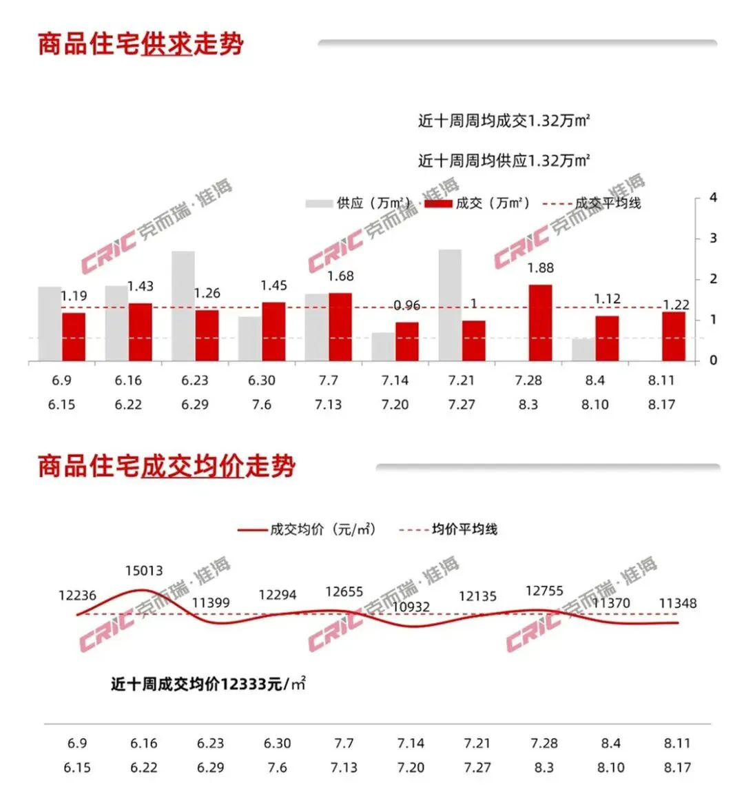 据克而瑞数据显示,上周8月11日-8月17日期间徐州市区商品住宅成交1.22万㎡,环比小幅上涨9.50%;平均网签均价为11348元/㎡,环比微跌0.20%。