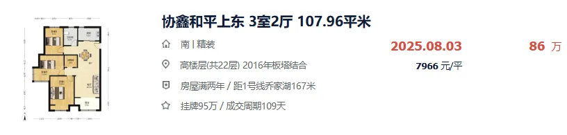 比如,8月3日,东区乔家湖地铁站附近的和平上东成交了一套建面约107㎡的房源,成交总价86万,单价7966元/㎡。要知去年之时,该小区成交的单价最便宜的房源都有8530元/㎡。