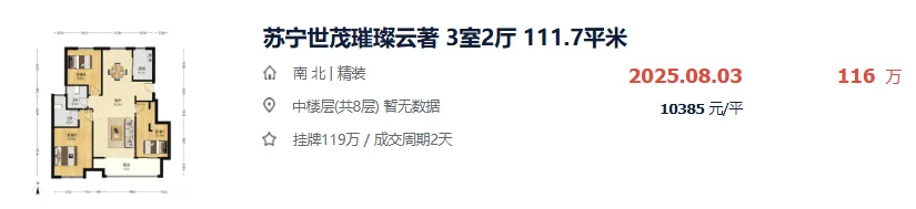 8月3日,北区九里苏宁世茂璀璨云著成交了首套房源,一套建面约111㎡的洋房,成交总价116万,单价10385元/㎡。当年2021年首开的开盘价为17100元/㎡,业主亏了不少。