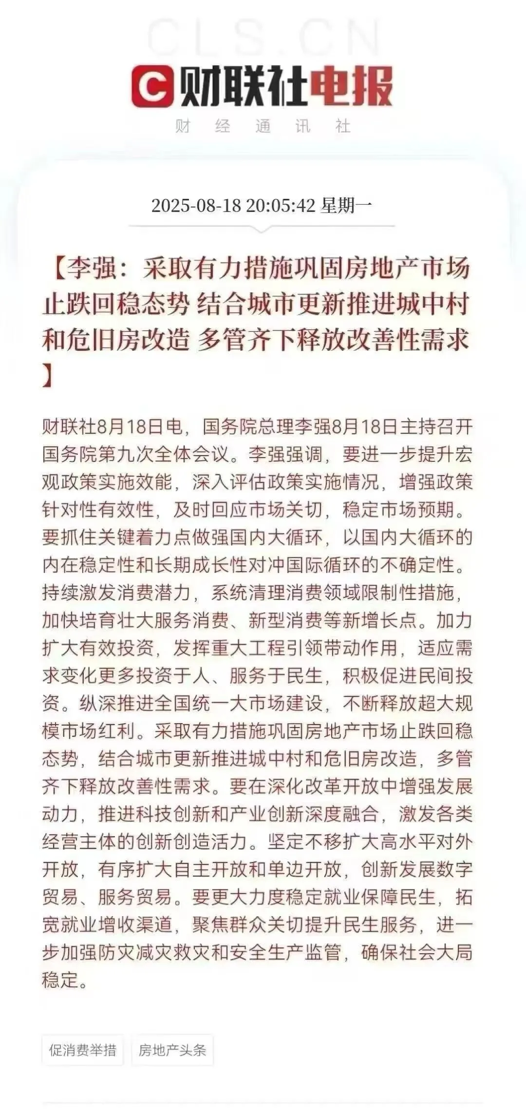 李总8月18日主持召开GW院第九次全体会议,学习研究分析当前经济形势和经济工作,明确提出:采取有力措施巩固房地产市场止跌回稳态势,结合城市更新推进城中村和危旧房改造,多管齐下释放改善性需求。