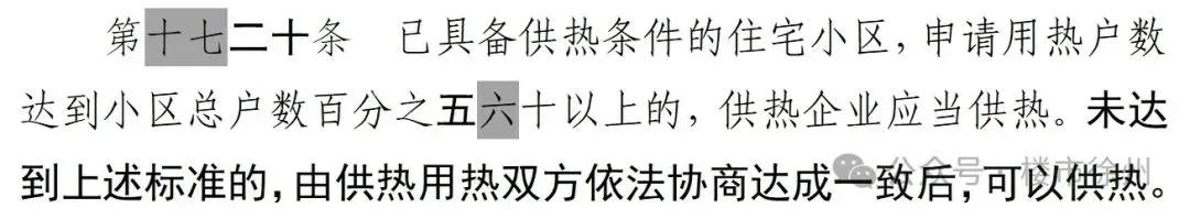 修订草案第二十条规定,已具备供热条件的住宅小区,申请用热户数达到小区总户数百分之五十以上的,供热企业应当供热。未达到上述标准的,由供热用热双方依法协商达成一致后,可以供热。