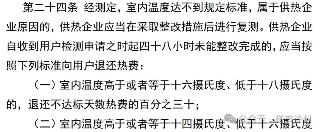 第二十四条规定,经测定,室内温度达不到规定标准,属于供热企业原因的,供热企业应当在采取整改措施后进行复测。供热企业自收到用户检测申请之时起四十八小时未能整改完成的,应当按照下列标准向用户退还热费: