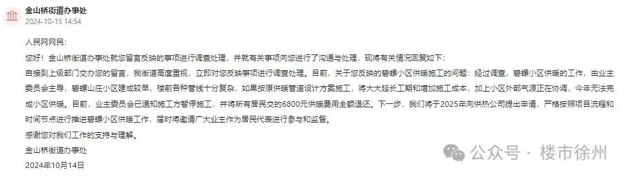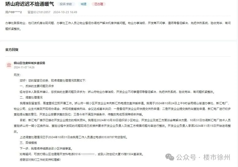 今天我在官媒发布的信息以及人民网领导留言板看到,官方回复了徐州一批小区的供暖问题。