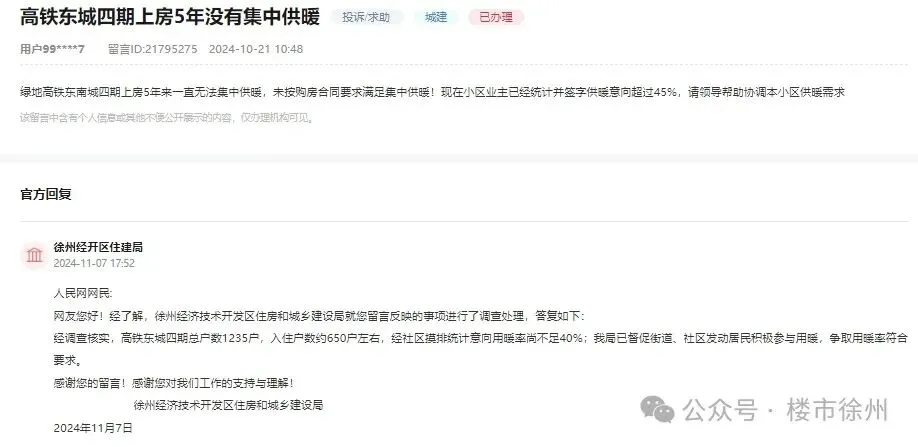 徐州经开区住建局给予回复:经调查核实,高铁东城四期总户数1235户,入住户数约650户左右,经社区摸排统计意向用暖率尚不足40%;我局已督促街道、社区发动居民积极参与用暖,争取用暖率符合要求。