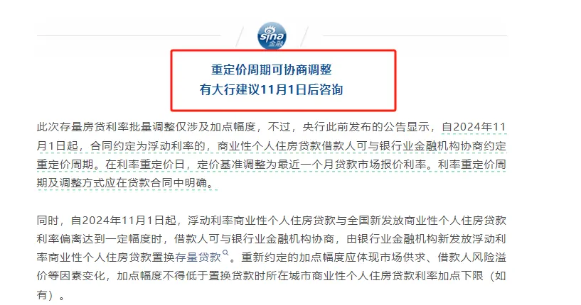 自2024年11月1日起,合同约定为浮动利率的,商业性个人住房贷款借款人可与银行业金融机构协商约定重定价周期。在利率重定价日,定价基准调整为最近一个月贷款市场报价利率。利率重定价周期及调整方式应在贷款合同中明确。