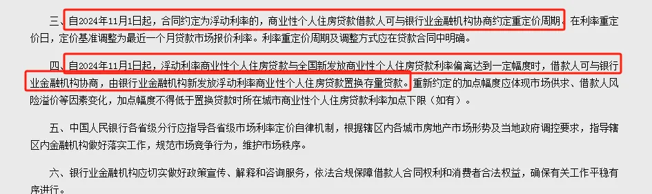 自2024年11月1日起,浮动利率商业性个人住房贷款与全国新发放商业性个人住房贷款利率偏离达到一定幅度时,借款人可与银行业金融机构协商,由银行业金融机构新发放浮动利率商业性个人住房贷款置换存量贷款。重新约定的加点幅度应体现市场供求、借款人风险溢价等因素变化,加点幅度不得低于置换贷款时所在城市商业性个人住房贷款利率加点下限(如有)。