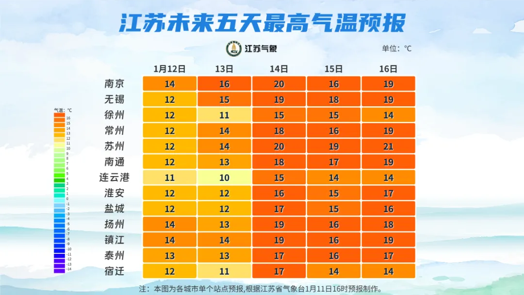 预计未来10天:全省17-20日有降水过程,平均温度较常年同期偏高4℃左右。12日白天起全省气温明显回升,16日全省最高温度:沿江和苏南地区20℃左右,淮北地区15℃左右。