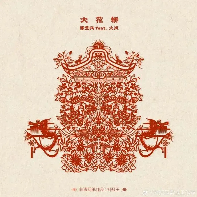 “没想到能为张艺兴老师的新歌设计封面,很荣幸!”刘冠玉欣喜地说。这幅名为《大花轿》的剪纸作品,以歌名为灵感,一顶花轿居中,周围环绕着龙凤、牡丹、喜鹊、仙鹤、蝴蝶等吉祥图案。
