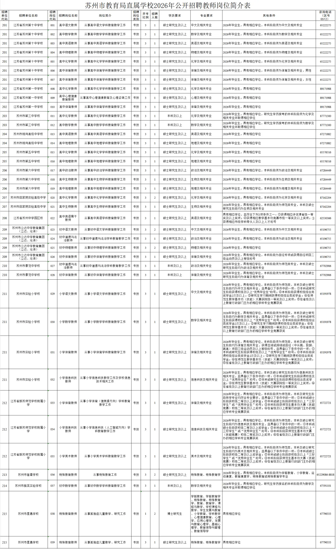 招聘岗位及条件等详见《苏州市教育局直属学校2026年公开招聘教师岗位简介表》(附件)。可在苏州市教育局网站(http://jyj.suzhou.gov.cn)、苏州市人力资源和社会保障局网站(http://hrss.suzhou.gov.cn)上查询。