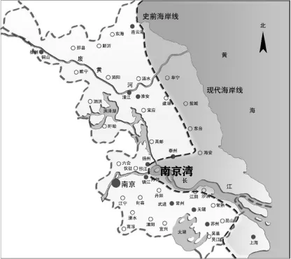5000-6000年前,东海比现代的海平面高2~4米,长江中下游高温多雨,森林茂密。古长江下游河面开阔。江苏省东南部的苏州,北部的南通和盐城,以及上海等地都在海水淹没之下。长江入海口在南京东部50公里的黄天荡一带,形成南京海湾,此地长江依然是洪水浩荡无际,周围沼泽遍布,入海口处是一个巨大的自然岸线凹槽地,中国第四纪研究称此地“南京湾”。(图3. 6500年前华东海岸线和南京湾)