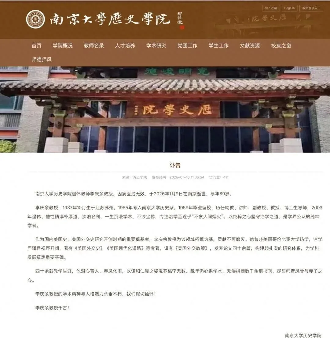 南京大学历史学院发布的讣告,南京大学历史学院退休教师李庆余教授,因病医治无效,于2026年1月9日在南京逝世,享年89岁。