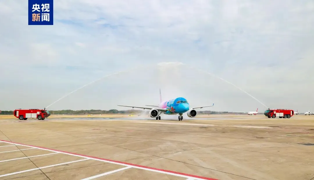 记者从中国南方航空了解到,1月12日,国产大飞机C919首次执飞广州往返南京航线,首航航班选用国内首架C919十五运会彩绘飞机“大美湾区”号执飞。飞机当天平稳降落在南京禄口国际机场后,缓缓穿过象征民航最高礼仪的“水门”。这标志着国产大飞机C919的航线网络进一步加密。
