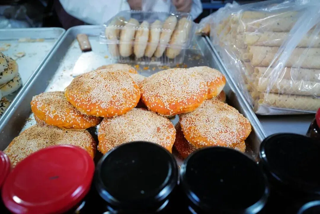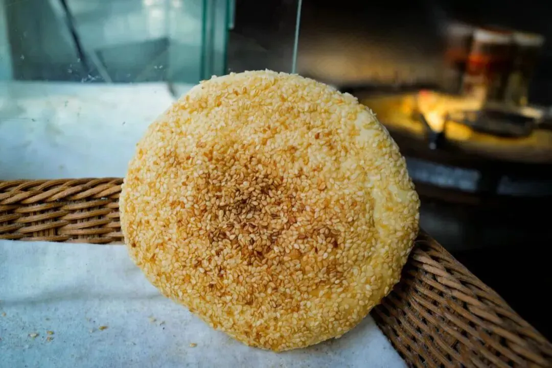 红字招牌上列明各种糕点价格,甜、咸、辣口味齐全,满足不同人群需求。推荐麻辣味和山楂白糖味,酥饼烤得超级脆却不干,轻轻一掰就裂开,芝麻香气四溢,咬一口掉渣不停,越品越香。