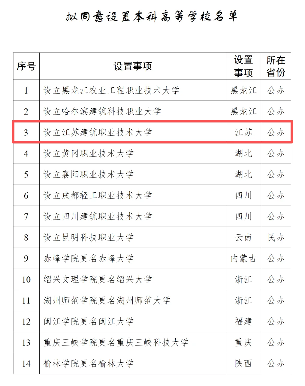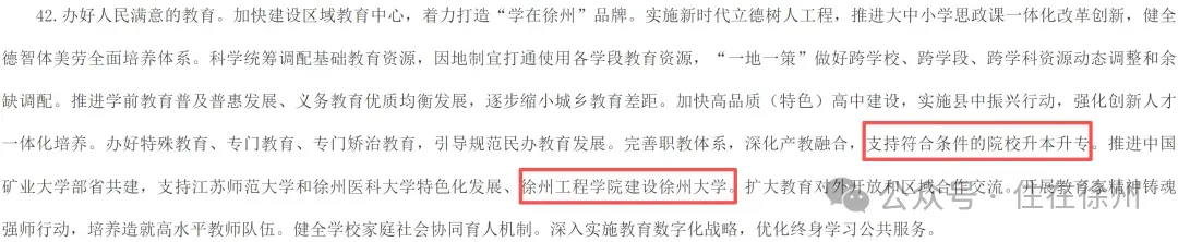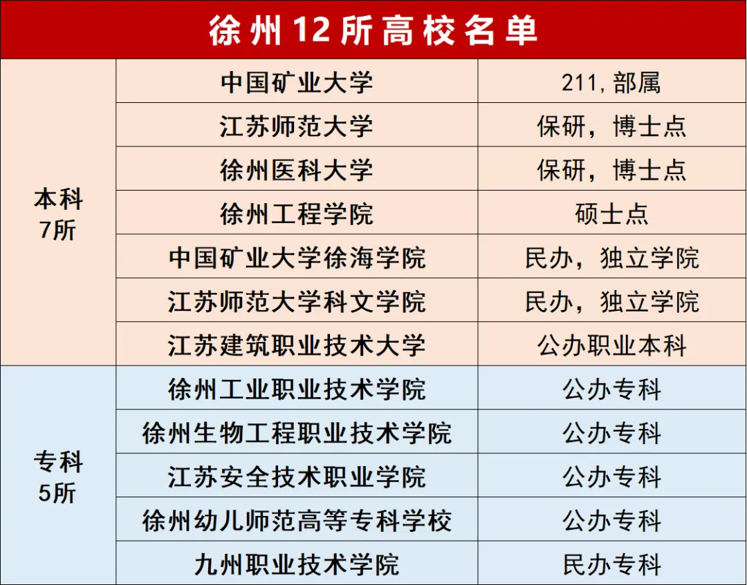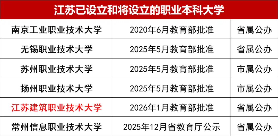如果说高职院校有211的话,那么国家示范性高职学院(全国只有100所),就相当于专科里的211。而江苏只有7所,江苏建筑职业技术学院名列其中。2025年3月21日,江苏省教育厅正式公示:明确以江苏建筑职业技术学院为基础,整合资源拟设立省属公办本科层次职业学校 —— 江苏建筑职业技术大学,公示期顺利通过,升格进入国家级审批阶段。元旦前,学校在新年献词中正式官宣:创建职业本科大学的各项核心条件全面达标。意味着,升本迎来临门一脚。果然,现在教育部就正式批复公示了。江苏建筑职业技术大学,性质为省属公办“职业本科”,定位仍是职业教育类型,培养的是技术技能人才。在专业设置上,与普通本科院校的专业也有区别。目前,全国已经50多所本科职业大学,江苏第一所是南京工业职业技术大学,另外,2025年5月,苏州职业技术大学、扬州职业技术大学、无锡职业技术大学已经获批升本。现在,江苏建筑职业技术大学公示拟升本,将成为江苏第5所职业本科大学,也将是徐州第7所本科院校。也是在中国矿业大学、江苏师范大学、徐州医科大学之后,徐州第4所“大学”。徐州另一所公办院校——徐州工程学院,规划升级更名为“徐州大学”。2024年首次获批3个硕士点,2025年首批正式招硕士生,估计还要等几年才能升级为大学。而在刚刚公布的徐州十五五规划建议中,明确提到:支持徐州工程学院建设徐州大学!意味着5年内徐州大学有望梦想成真。除此之外,徐州十五五规划还提到:支持符合条件的院校升本升专。据之前报道:徐州工业职业技术学院"创建工业特色鲜明的本科层次职业学校",很有希望在江苏建院之后,成为徐州第8所本科院校。另外,徐州生物工程职业技术学院、徐州幼师,也都提出了升本的目标。徐州医药高等职业学校,正在冲刺创建升级为高职院校,随着东湖新校区的建成启用,实现“升专”目标也快了。