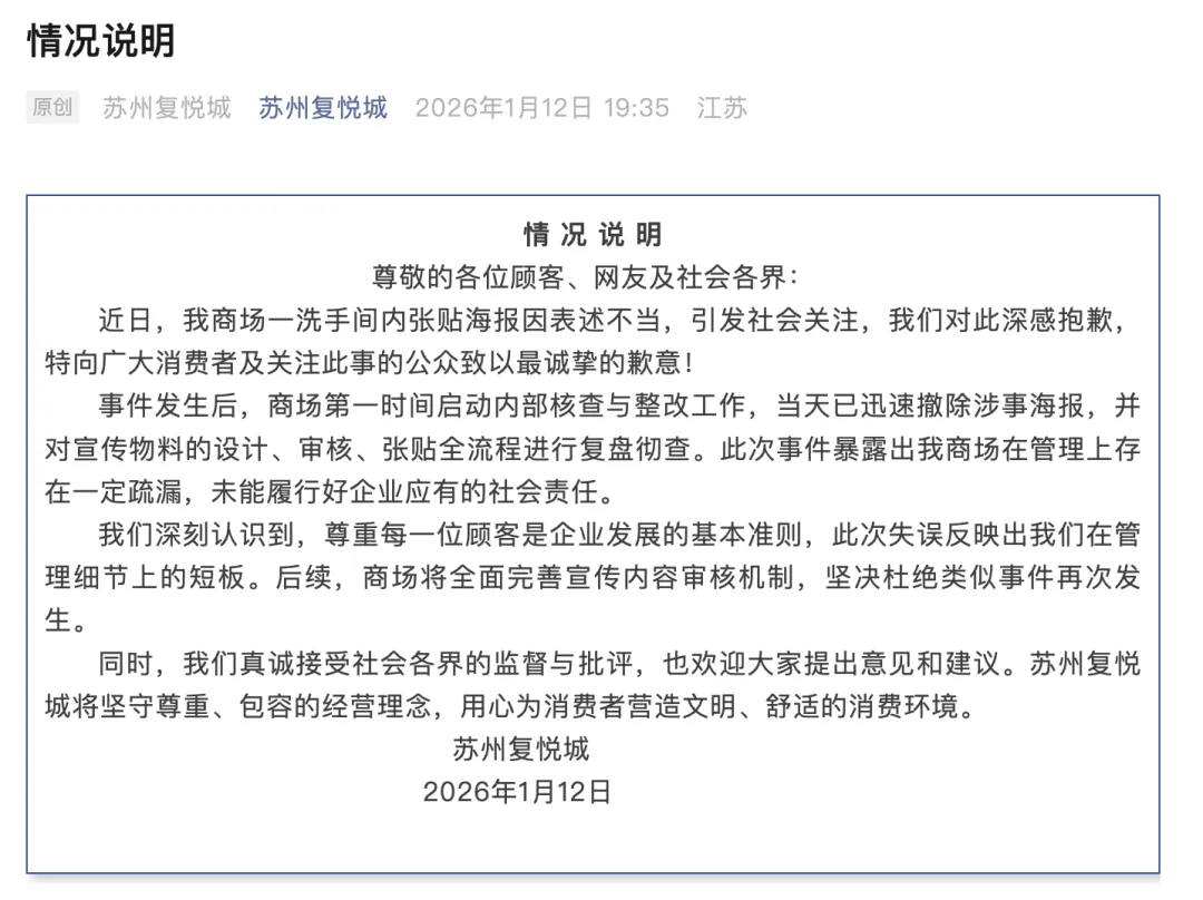 12日晚,“苏州复悦城”微信公众号发布情况说明,全文如下:近日,我商场一洗手间内张贴海报因表述不当,引发社会关注,我们对此深感抱歉,特向广大消费者及关注此事的公众致以最诚挚的歉意!事件发生后,商场第一时间启动内部核查与整改工作,当天已迅速撤除涉事海报,并对宣传物料的设计、审核、张贴全流程进行复盘彻查。此次事件暴露出我商场在管理上存在一定疏漏,未能履行好企业应有的社会责任。我们深刻认识到,尊重每一位顾客是企业发展的基本准则,此次失误反映出我们在管理细节上的短板。后续,商场将全面完善宣传内容审核机制,坚决杜绝类似事件再次发生。