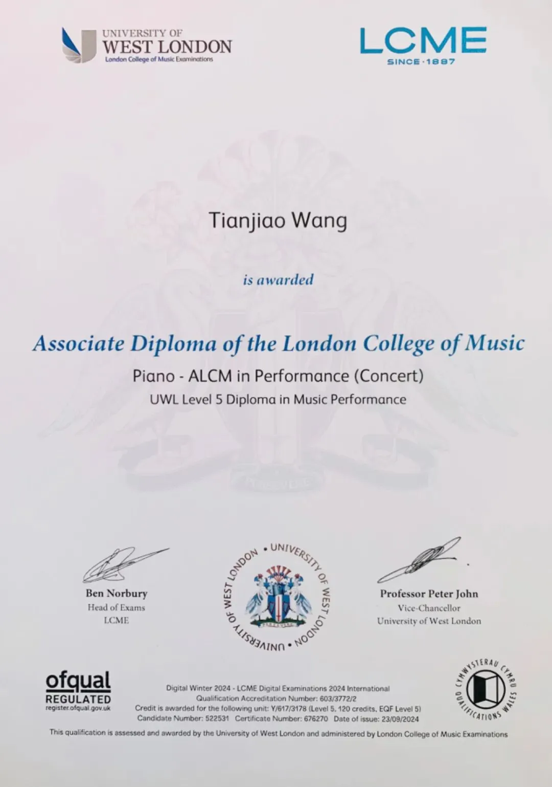英国皇家音乐学院 钢琴演奏证书