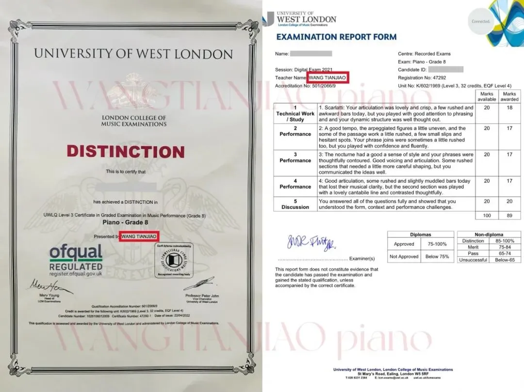 伦敦音乐学院 钢琴演奏八级证书成绩单