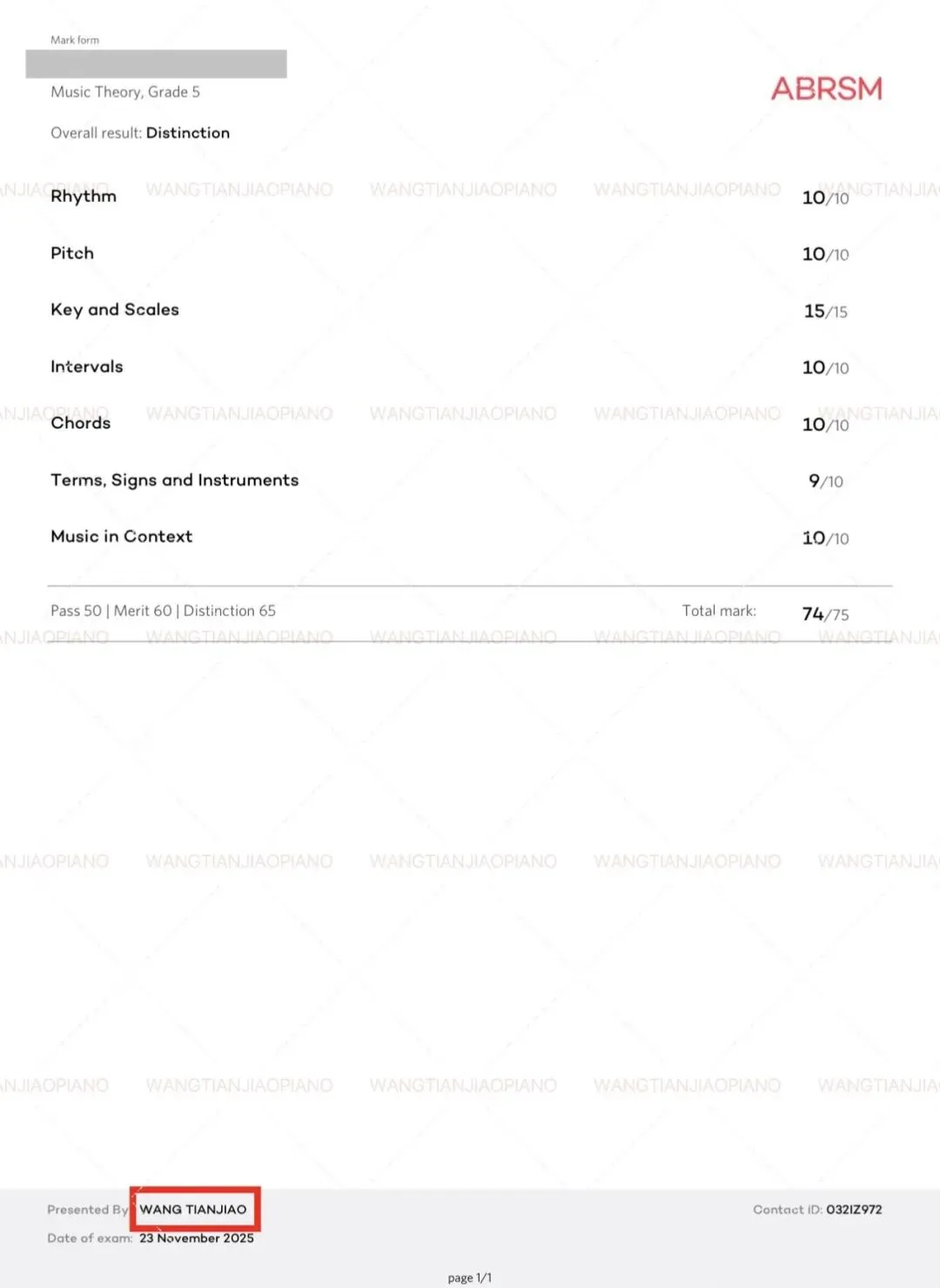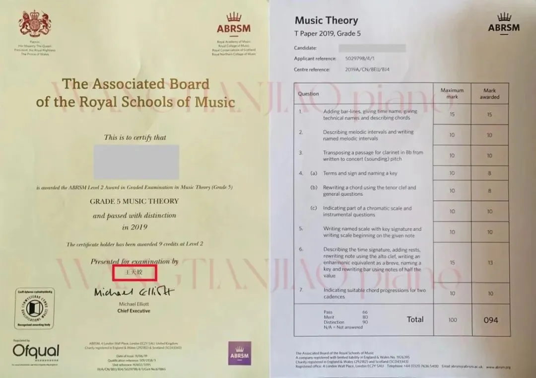 英国皇家音乐学院 五级乐理证书成绩单