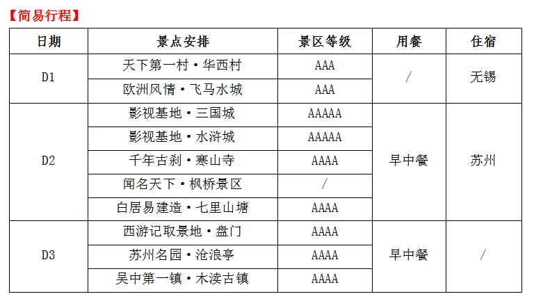 早餐后,游览东方好莱坞、中央电视台无锡影视基地、国家5A景区【三国城】位于无锡市区西南部。南依太湖,北接梁溪、惠山两区;景区始建于1987年,占地35公顷;三国景点内建造了具有影视文化特色和具有浓郁汉代风格的“三英战吕布”、”吴王宫”、“甘露寺”、“曹营水旱寨”、“吴营”、“七星坛”、“跑马场”、“点将台”等几十处大型景点。后因发展需要,又陆续添置了“桃园”、“九宫八卦阵”、“火烧赤壁”、“特技场”、“竞技场”、“赤壁古栈道”等景点,丰富、充实了景区文化内容,弘扬了民族传统文化。是中视股份继唐城景区之后推出的又一座集影视拍摄、旅游功能于一体的影视城。游览中央电视台无锡影视基地、国家5A景区【水浒城】位于太湖之滨,南面与三国城相邻,西濒太湖,占地580亩,可供拍摄的水上面积1500亩,中央电视台为拍摄大型电视连续剧《水浒传》而投资建造的又一个影视拍摄基地,1996年3月《水浒传》剧组进驻开拍,水浒城主体景观可分为州县区、京城区、梁山区三大部分,让人仿佛穿越水浒世界,尽享历史文化之旅。主要景点有皇宫、樊楼、清明上河街、御街、紫石街、水泊梁山等。后车赴苏州,游览国家4A景区【千年古刹-寒山寺景区】其历史遗迹而被列为中国十大寺庙之一。唐代贞观年间,当时的名僧寒山、希迁两位高僧创建寒山寺。1000多年内寒山寺先后5次遭到火毁(一说是7次),最后一次重建是清代光绪年间。历史上寒山寺曾是中国十大名寺之一,寺内古迹甚多,有张继诗的石刻碑文,寒山、拾得的石刻像,文徵明、唐寅所书碑文残片等。后游览【苏州枫桥】景区,枫桥是苏州西郊的一座古桥,位于姑苏区,跨上塘河。枫桥以唐代诗人张继的七绝《枫桥夜泊》而闻名天下,“月落乌啼霜满天,江枫渔火对愁眠…”。游览【七里山塘街】它东起阊门渡僧桥附近,西至虎丘望山桥,长约7里,故俗称“七里山塘到虎丘”。这条河在阊门与运河相接。在河塘旁筑堤,即山塘街。山塘河的开凿和山塘街的修建,大大便利了灌溉和交通,这一带成了热闹繁华的市井。苏州百姓非常感激白居易,他离任后,百姓即把山塘街称之为白公堤,还修建了白公祠,以作纪念。实时入住酒店休息。