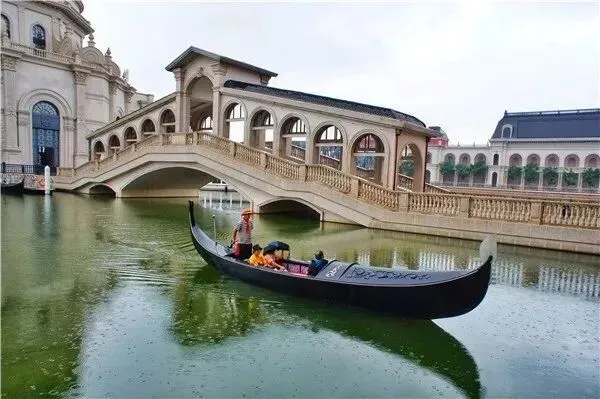 坐进了长长的贡多拉,船头与船尾都向上高高地翘起,船身装饰有许许多多的金色花纹,看上去很是华丽。小船穿越一座座欧式的小桥,那河水时而风平浪静,时而碧波荡漾,很有几分诗意哦。