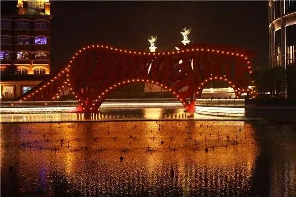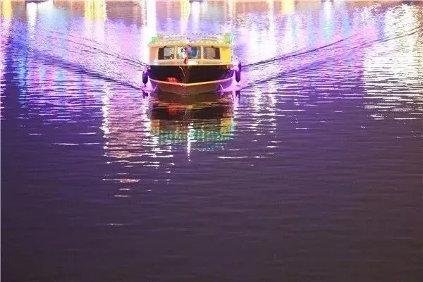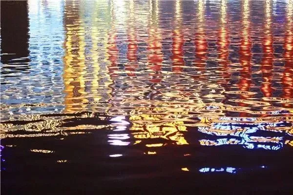 飞马水城的夜晚,是一座童话小镇。各种颜色的灯光在大桥上交替,水面被映得色彩斑澜,微风轻拂,流动的湖水中,有千点万点晶莹闪烁的光斑在跳动,湖两岸,楼房、小桥与钟楼在明亮的灯光下清晰可辨,但见小艇犁开水面,留下一串串梦境……