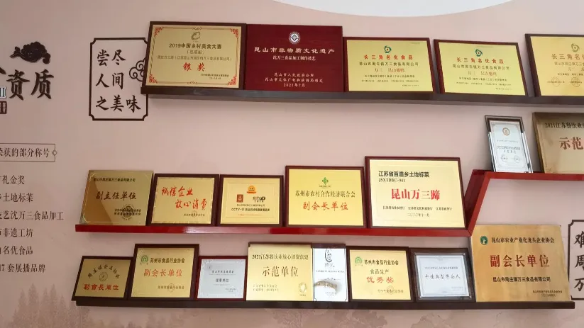 凭借卓越的产品品质与文化价值,公司屡获殊荣:2016年“苏州有礼金奖”、2020年“江苏省百道乡土地标菜”、2023年“长三角名优食品”、2024年“CCTV-17展播品牌”等。此外,企业还通过ISO22000食品安全质量认证,并成为苏州市食品行业协会副会长单位、江苏省餐饮业放心消费示范单位,公信力备受认可。