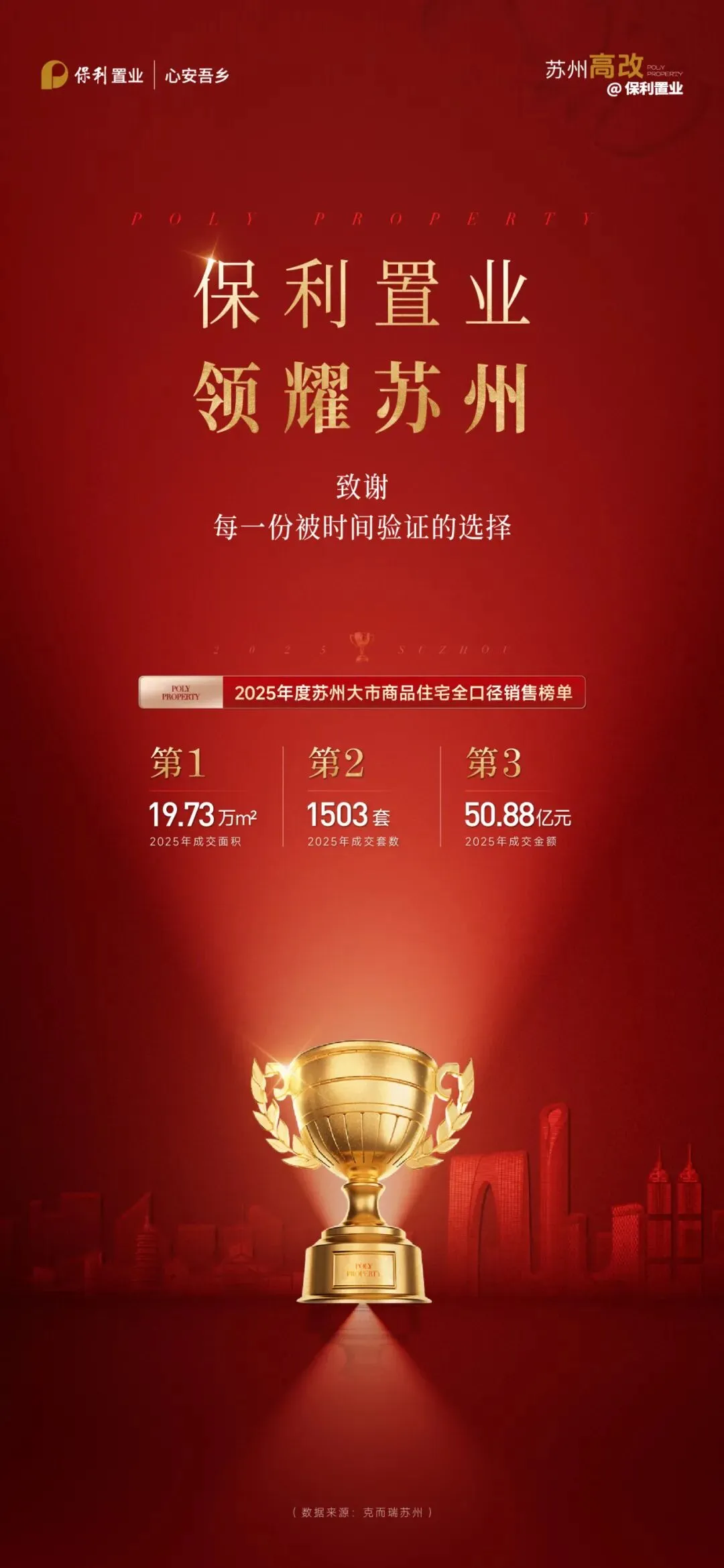 市场的奖杯,由数据铸就。2025年,保利在苏州大市商品住宅的终榜上,刻下了无可争议的荣耀:以19.73万㎡销售面积一举夺得面积榜冠军,以1503套销售套数、50.88亿元销售额揽获套数榜亚军、金额榜季军佳绩。这“三榜齐发”的格局,是品质高改的全面胜利。