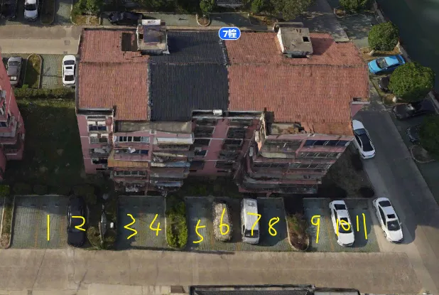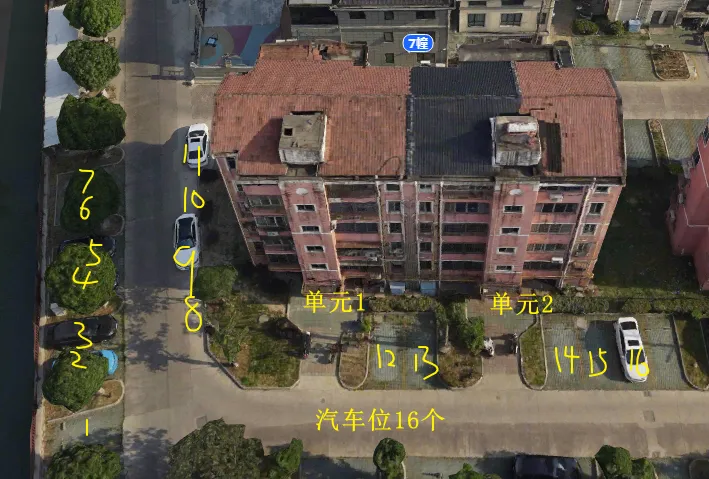 7栋有2个单元门,总高5层,总户数20户,汽车位27个。