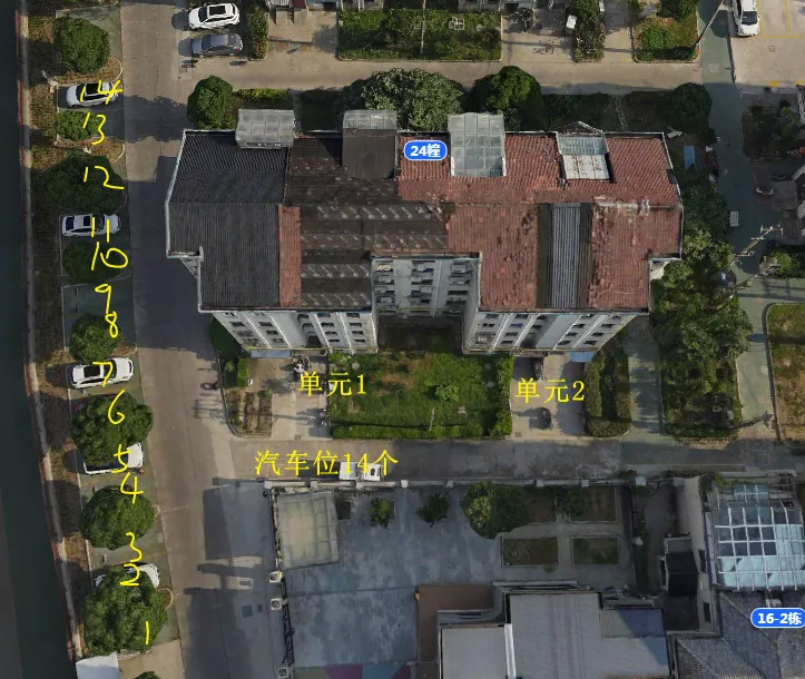 24栋有2个单元门,总高5层,总户数18户,汽车位14个。