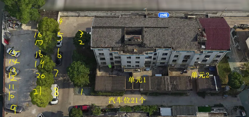 25栋有2个单元门,总高4层,总户数16户,汽车位21个。