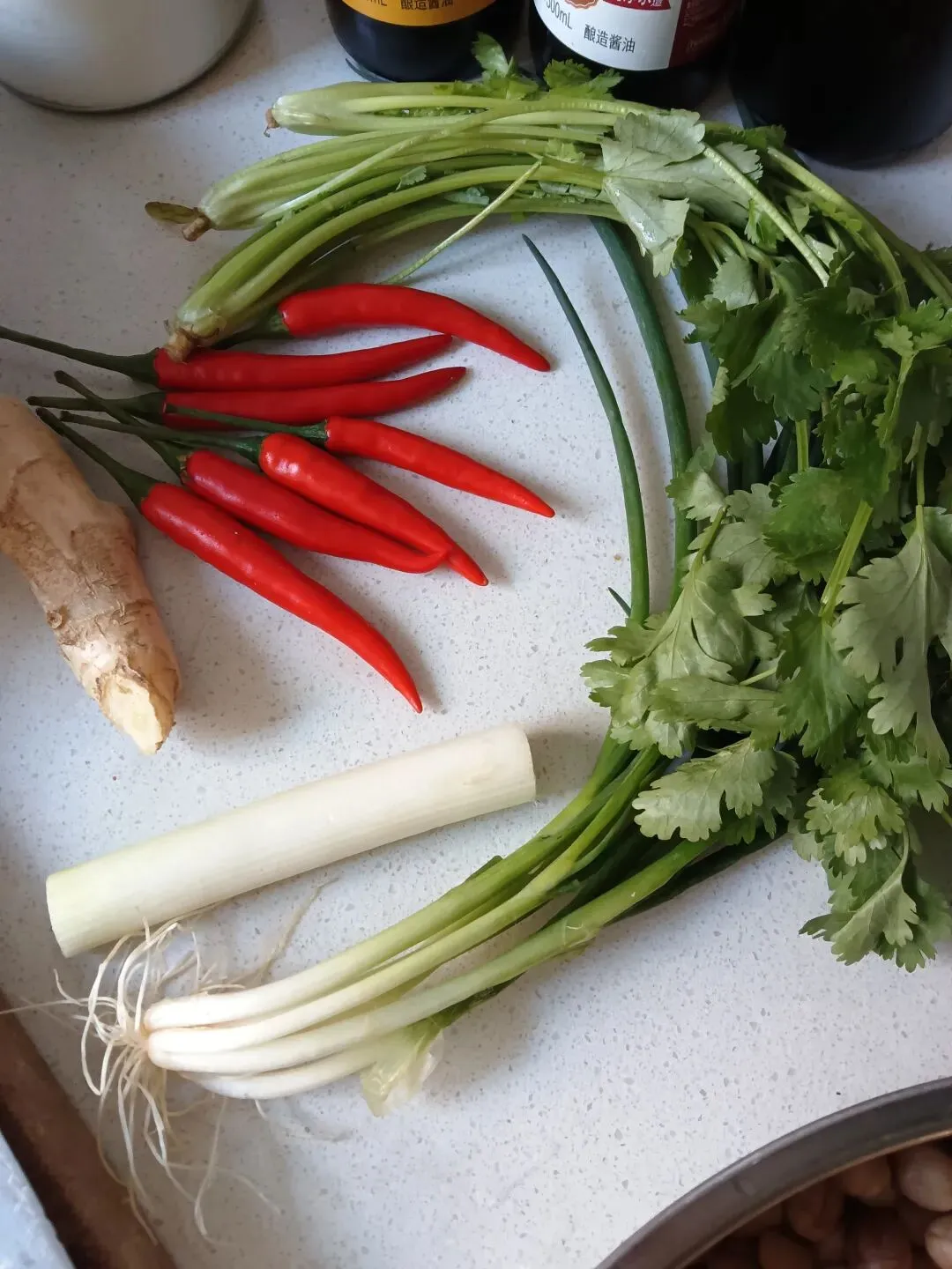 辅料:葱、姜、辣椒、芫荽(也可不用)、八角、花椒