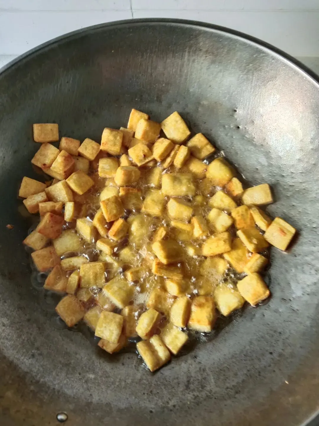 2.锅中放油,油热后放入放入豆腐干,炸至金黄出锅。然后再放入五花肉,把肉里的油煸炒出来时,再放入辅料炒香。