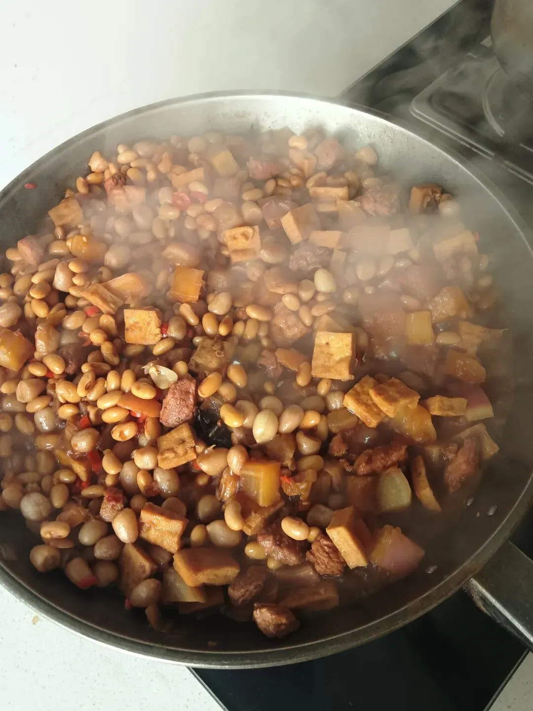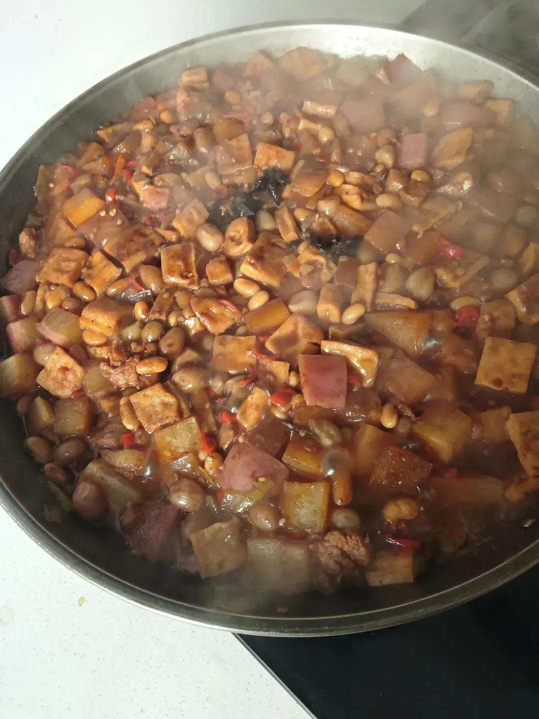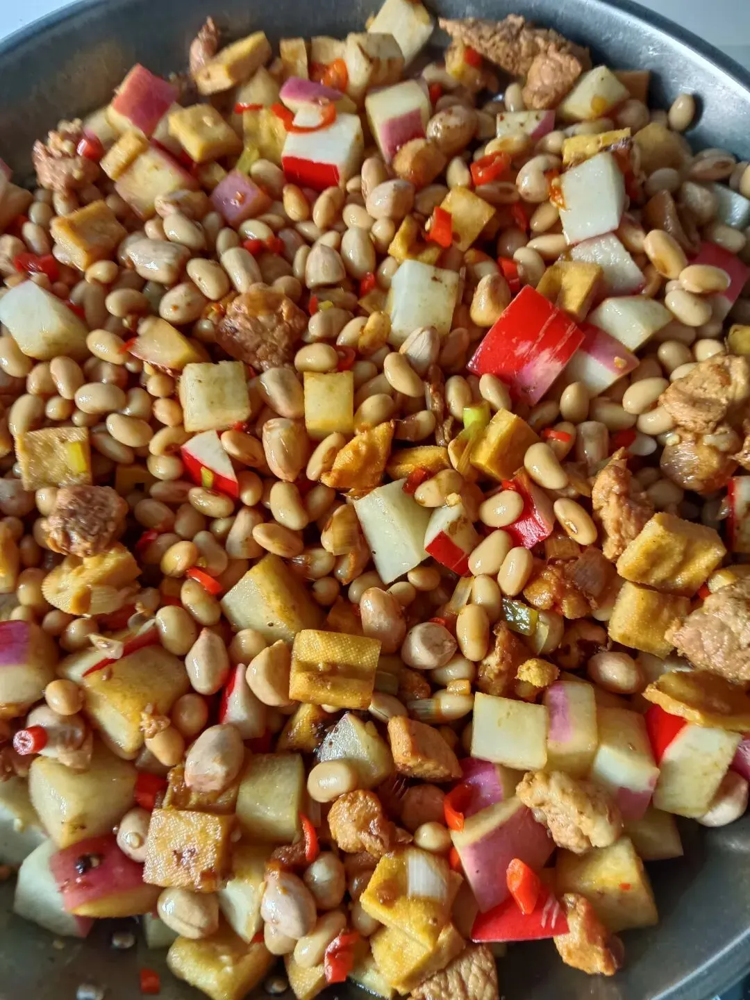 原料:五花肉、红萝卜、豆腐干、花生米、黄豆(或青豆)。