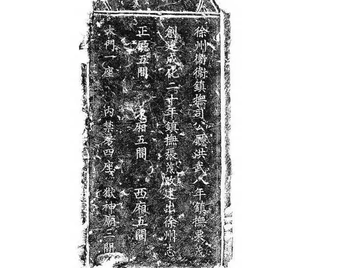 工地上传来喜讯,挖到一块带字的石碑!碑上清晰刻着“徐州卫镇抚司公厅,洪武八年镇抚粟茂创建,成化二十年镇抚张茂改建,出徐州志。正厅五间,东厢五间,西厢五间,大门一座,内禁房四座,狱神殿三间”。成化二十年即公元1484年,这意味着,这里正是明朝徐州卫的军事指挥中心。