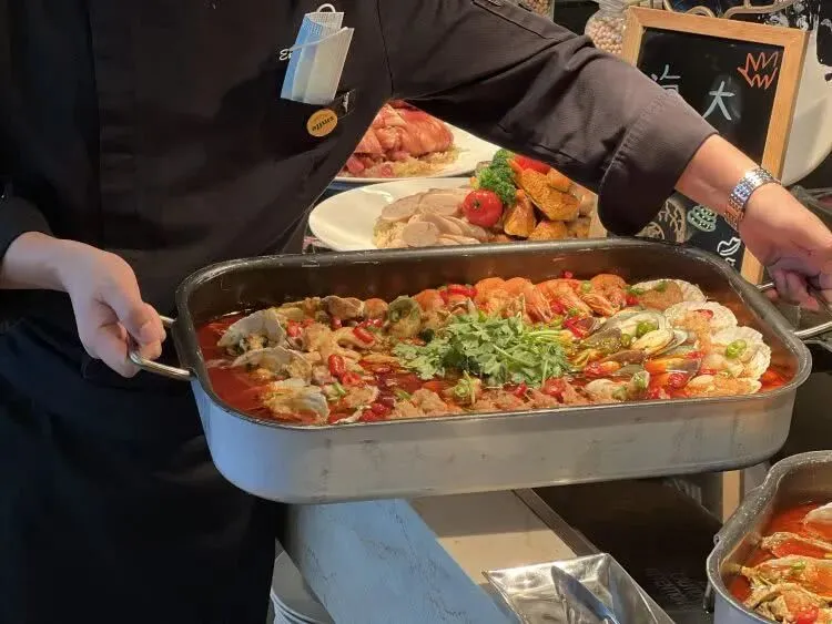 中西式的早餐结合,丰盛程度超乎想象。餐品齐全,既有刚出炉的面包、蛋糕卷,又有汤面、蒸点等中式早点。