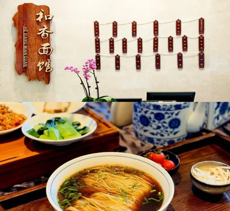 和香面馆是苏州烟火气的缩影。汤头以猪骨、鳝骨慢熬,鲜醇清亮;招牌焖肉面肥而不腻爆鱼面外脆里嫩,虾仁面鲜爽弹牙。搭配姜丝、雪菜,佐一碟油氽紧酵馒头,尽显江南精致。面馆里,食客“过桥”吃法、加面加浇,吴侬软语间,满是苏式生活的温润。