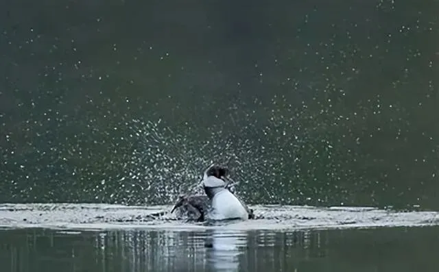 角䴙䴘的幼鸟厉害 , 刚出生没多久就能下水游泳 , 不过大鸟还是会把孩子驮在背上带着走。