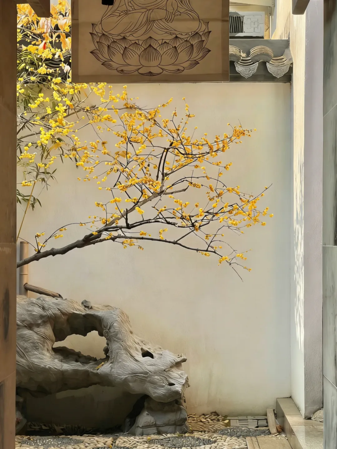 那抹亮黄与粉墙黛瓦相映,禅意十足