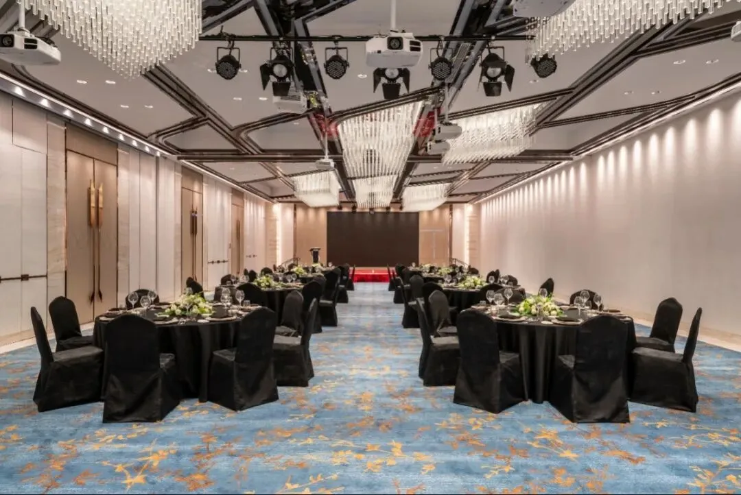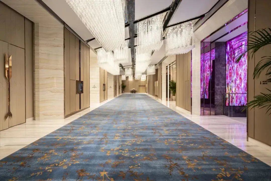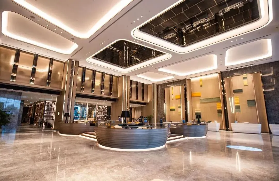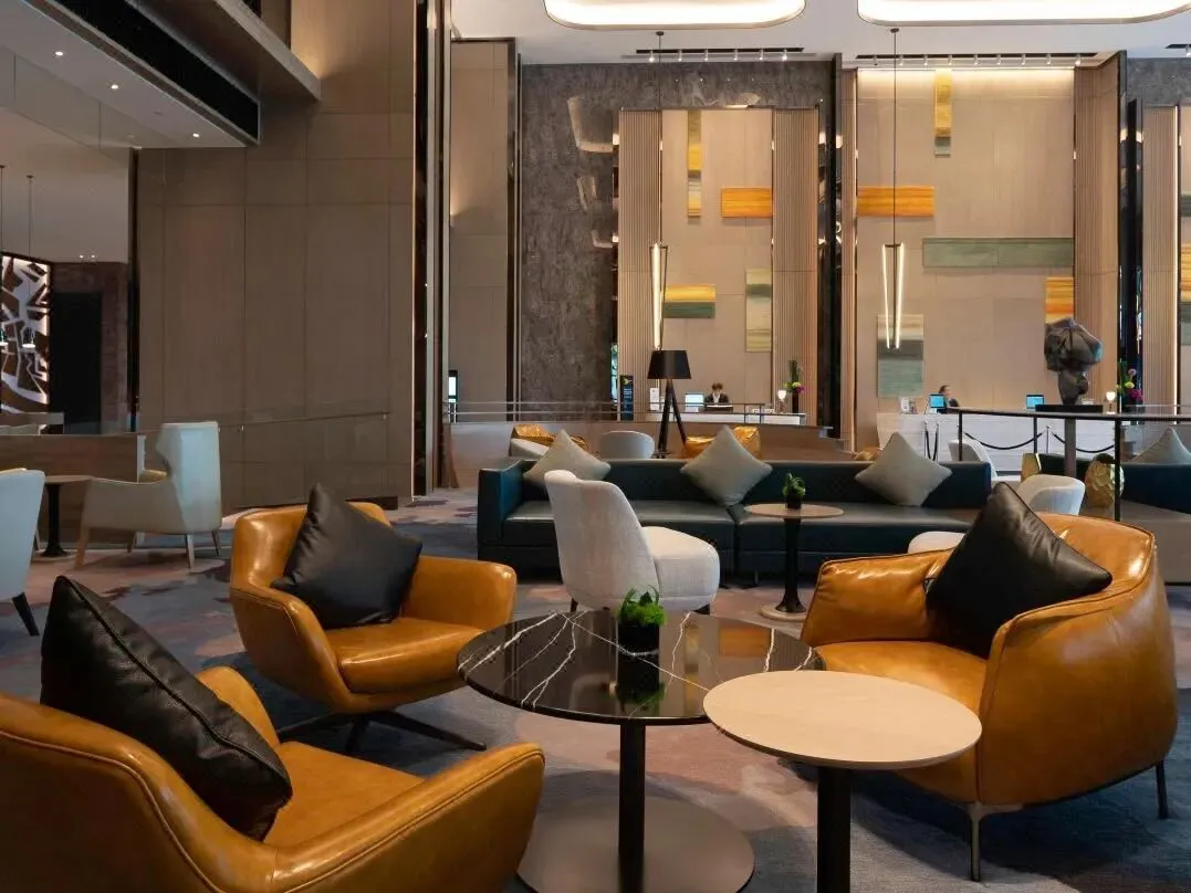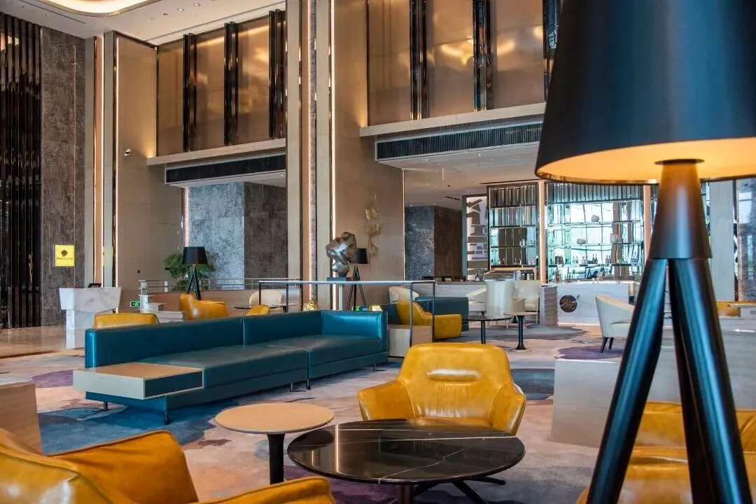 步入酒店大堂,映入眼帘的是法式的精致氛围,沙发座椅、水晶吊灯、金黄色的皮质地毯,,每一个细节都体现出设计的精巧与用心,尽显奢华。