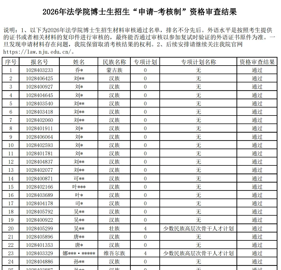 >南京大学2026年法学院博士生招生“申请-考核制”资格审查结果