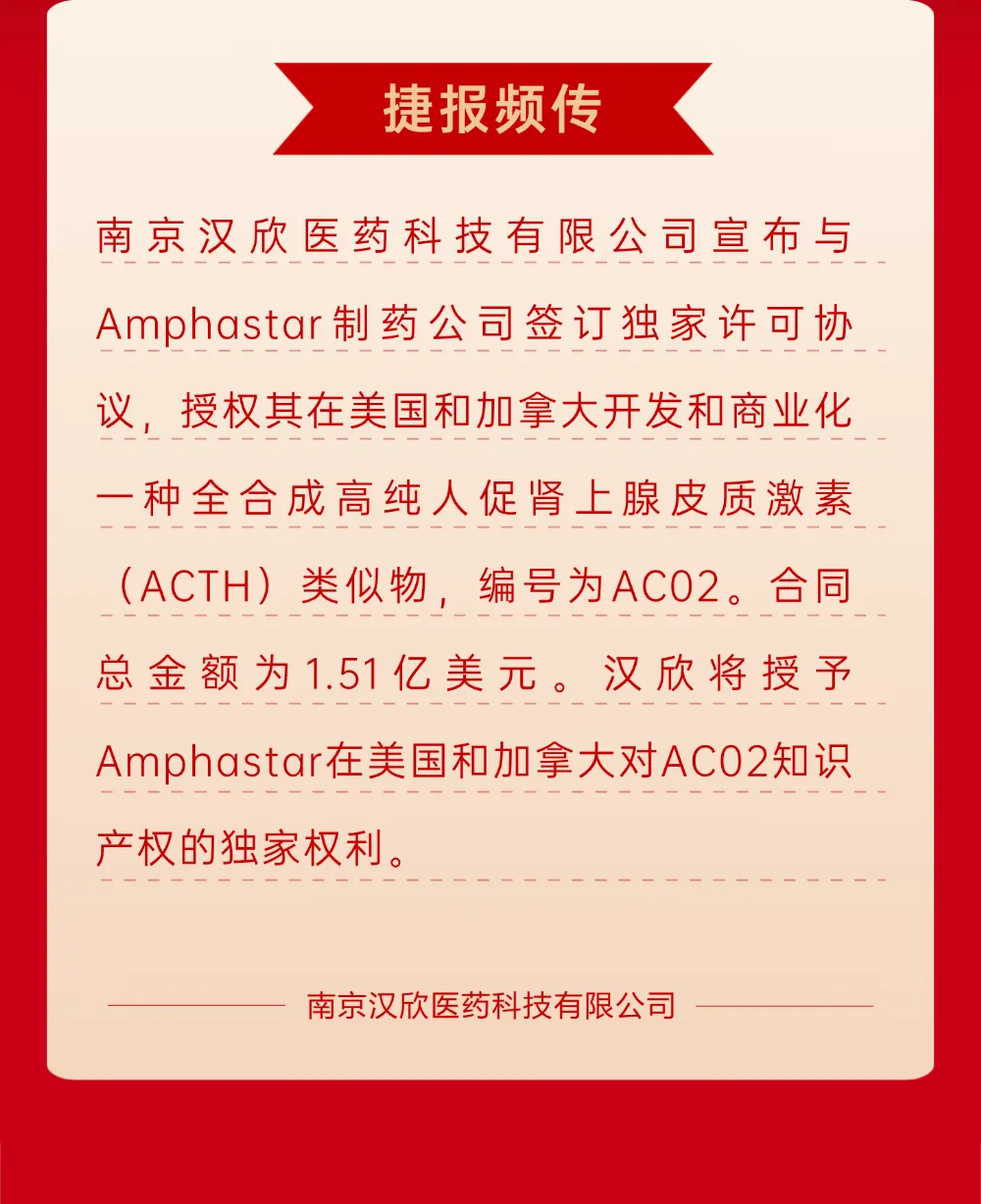 >南京汉欣医药科技有限公司与Amphastar Pharmaceuticals签署合成ACTH独家许可协议
