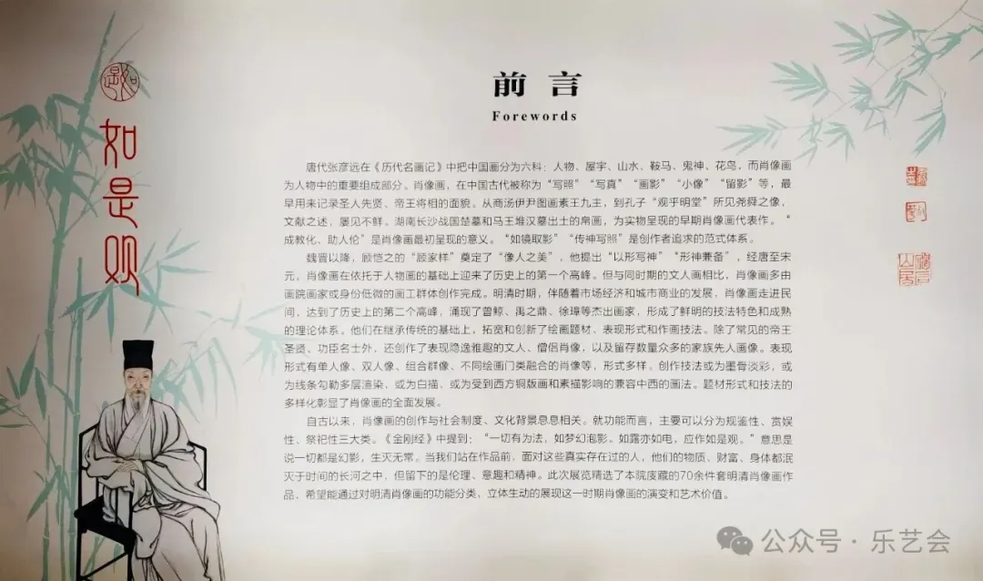 展览以"敦伦明理""移情逐景""千秋永昌"三大板块构建叙事框架。第一板块聚焦明代官员朝服像,展现礼制规范下的肖像画特征;第二板块通过文人雅集场景呈现生活美学;第三板块突出历史人物肖像的教化功能。这种分类方式系统梳理了明清肖像画的社会功能与艺术表达。