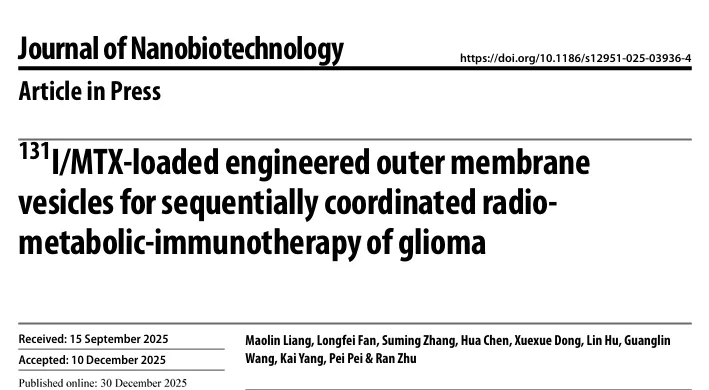 2025年12月,苏州大学朱然教授团队在Journal of Nanobiotechnology在线发表论文“131I/MTX-loaded engineered outer membrane vesicles for sequentially coordinated radio-metabolic-immunotherapy of glioma”,该研究设计了一种搭载放射性碘-131和抗癌药物甲氨蝶呤的细菌外膜囊泡,攻克了脑胶质瘤放疗易耐受、免疫微环境“冷”且难激活的关键难题。通过基因工程改造囊泡表面蛋白并实现双药精准共载,实现了放射杀伤、代谢阻断与免疫唤醒三步协同。显著抑制了肿瘤生长并延长小鼠生存期,为脑瘤综合治疗提供了新范式。