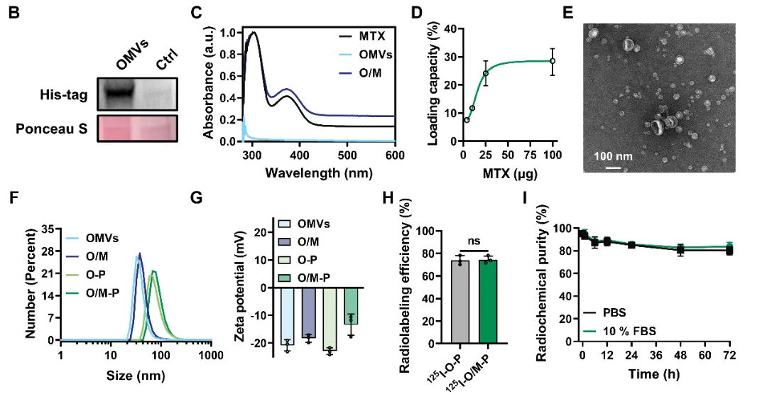 作者通过基因工程技术将富含酪氨酸和脯氨酸的唾液酸蛋白statherin(STATH)整合到减毒沙门氏菌VNP20009的外膜上,使STATH在囊泡表面成功表达。随后利用探头超声法和及挤出法进行OMVs的MTX负载和PEG表面修饰,并通过透射电镜(TEM)、DLS与Zeta电位测试等证实了O/M-P的成功合成。此外,OMVs表面表达含有多个酪氨酸残基的STATH,使O/M-P的放射性碘(131I/125I)标记成为可能,并获得了具有较高放射性标记效率和良好体外放射化学稳定性的131I/125I-O/M-P(图1)。这些发现表明多功能纳米平台(131I-O/M-P)的成功构建,为后续实现肿瘤细胞代谢干扰、放疗增敏和免疫激活的协同治疗提供了坚实的材料基础。