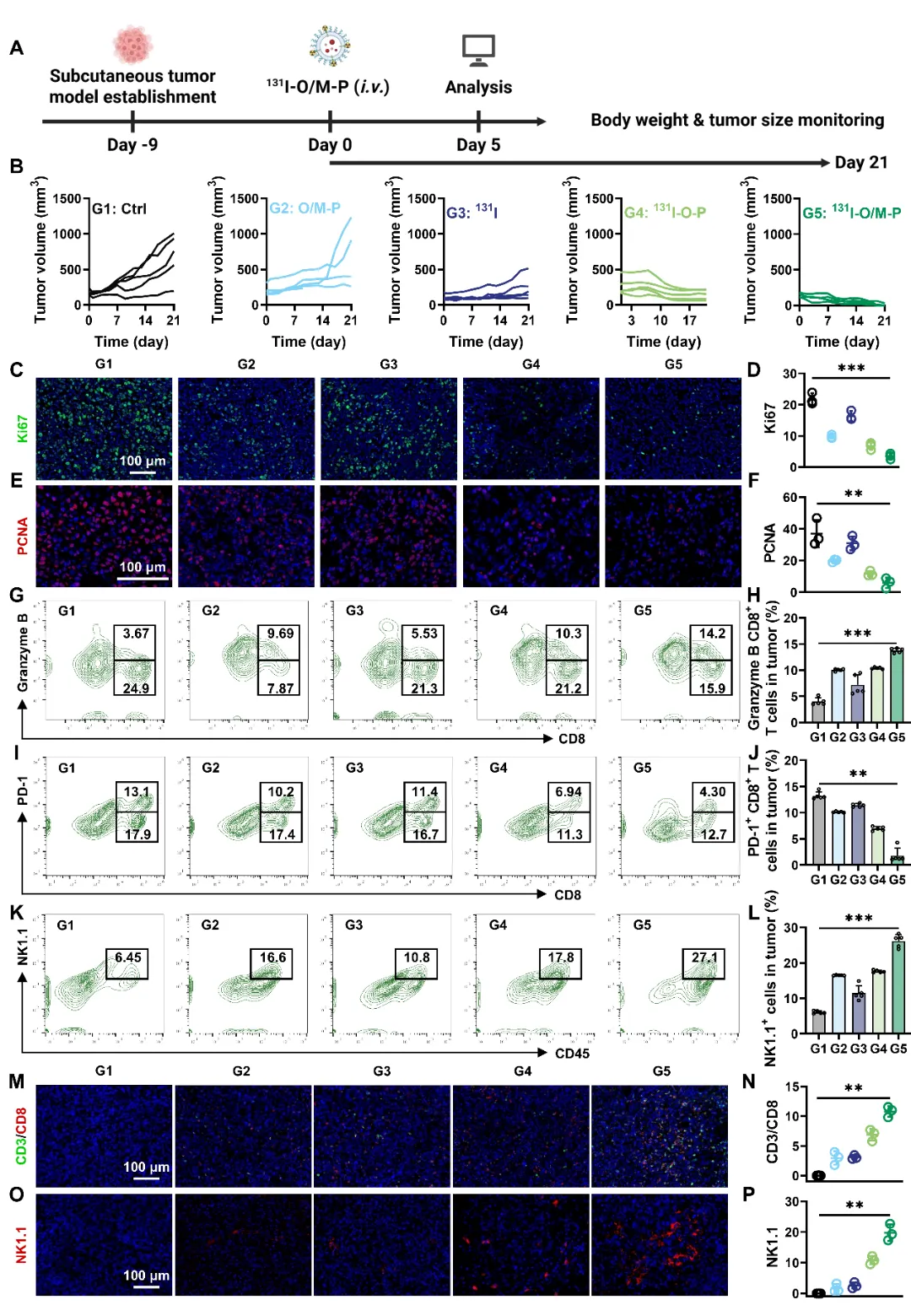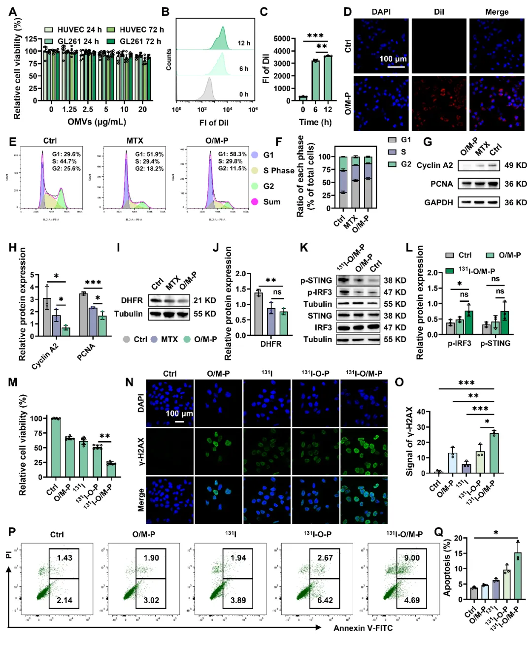 在完成O/M-P的理化性质评估后,进一步在细胞水平系统验证其代谢干扰与放疗增敏效应。细胞水平验证显示其具备良好的细胞相容性,能够高效进入肿瘤细胞;抑制肿瘤细胞周期G1/S转换,下调细胞周期/复制相关蛋白Cyclin A2与PCNA的表达,同时降低DHFR蛋白水平发挥代谢干扰作用。在此基础上构建的131I-O/M-P可以直接造成DNA双链断裂(DSBs),从而杀死肿瘤细胞,使凋亡增加。同时其可显著升高p-STING及p-IRF3水平,激活cGAS-STING通路以奠定体内免疫相关过程的分子基础(图2)。因此,131I-O/M-P在细胞层面实现了由代谢抑制与周期调控出发,叠加131I诱导的DNA损伤并伴随cGAS-STING轴激活,进而转化为增强的细胞抑制与凋亡的顺序协同过程,与后续体内放射-代谢-免疫治疗提供基础。